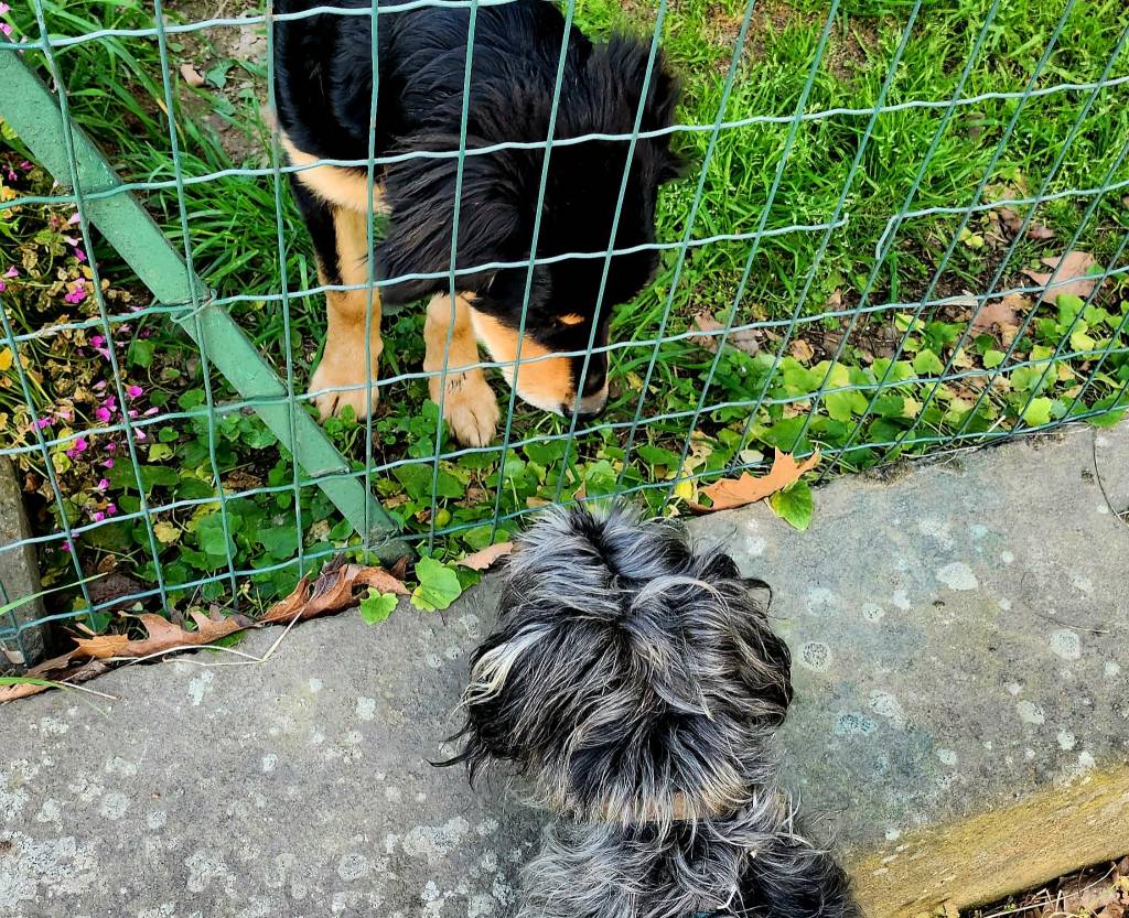 Da quando abbiamo cambiato casa Muttley si è trovato un amico dall’altro lato della strada. È un border collie di tre colori che vive in una casa colonica proprio di fronte alla nostra. Si annusano e rincorrono attraverso la rete che delimita il suo giardino, e ogni mattina piagnucolano entrambi finché non ci avviciniamo per un saluto.